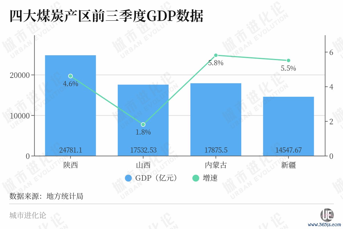 今年前三季度,山西、内蒙古、陕西和新疆GDP分别为1.75万亿元、1.79万亿元、2.48万亿元和1.45万亿元,同比分别增长1.8%、5.8%、4.6%、5.8%。