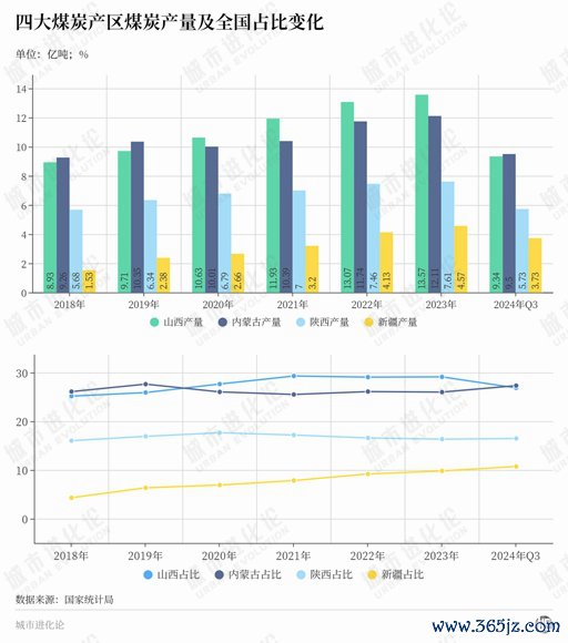 国家统计局数据显示,2024年前三季度山西、内蒙古、陕西和新疆原煤产量分别为9.34亿吨、9.5亿吨、5.73亿吨和3.73亿吨,贡献全国产量的81.42%。在过去五年多时间里,四大煤炭产区占全国的比重上升4.59%,其中新疆上升4.38%。